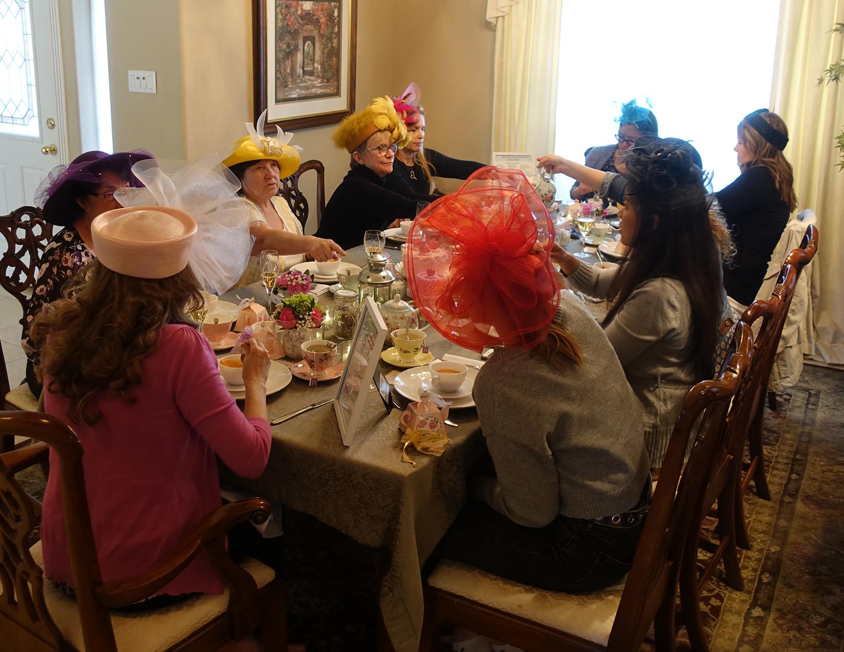 The traveling tearoom that comes to you! You choose the location and guests. I provide everything else – the tea, food, linens, teacups, tableware, silverware, even the soothing music if you like. I will set your table, cater and serve the delicious food, brew and serve the tea, and stay afterwards to do the dishes so you can focus on your guests. I can also host your indoor or outdoor event at my home for a complete pampered experience for you and your guests! Our afternoon tea menu includes delicious finger sandwiches, sweet and savory bites, homemade scones, fresh fruit, fresh-baked pastries, and scrumptious cakes. Food and tea are served using vintage dishes, china, cake stands, towers, and pretty teapots. The Traveling Teapot is available for any occasion – parties, showers, birthdays for little girls, birthdays for girls who are young at heart, get-togethers, hen parties, bridge clubs, gentlemen lunches, business meetings, just because it is a Tuesday, and more!